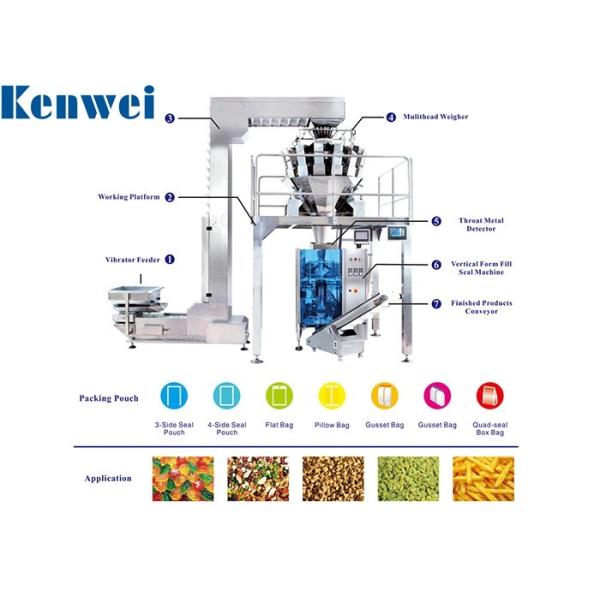 The system is including Vibrator feeder, Z bucket conveyor, Working platform, Multihead weigher, Vertical form fill seal machine, Finished product conveyor, Dropper metal detector. Vertical Form Fill Seal machines might be fitted with various types of product filler (weigher) options: linear system weighers, multihead weighers for granular products might be adapted to the vertical packaging machine. Thanks to a wide range of options, is fully customizable depending on the type of product to be packed: stainless steel structure.